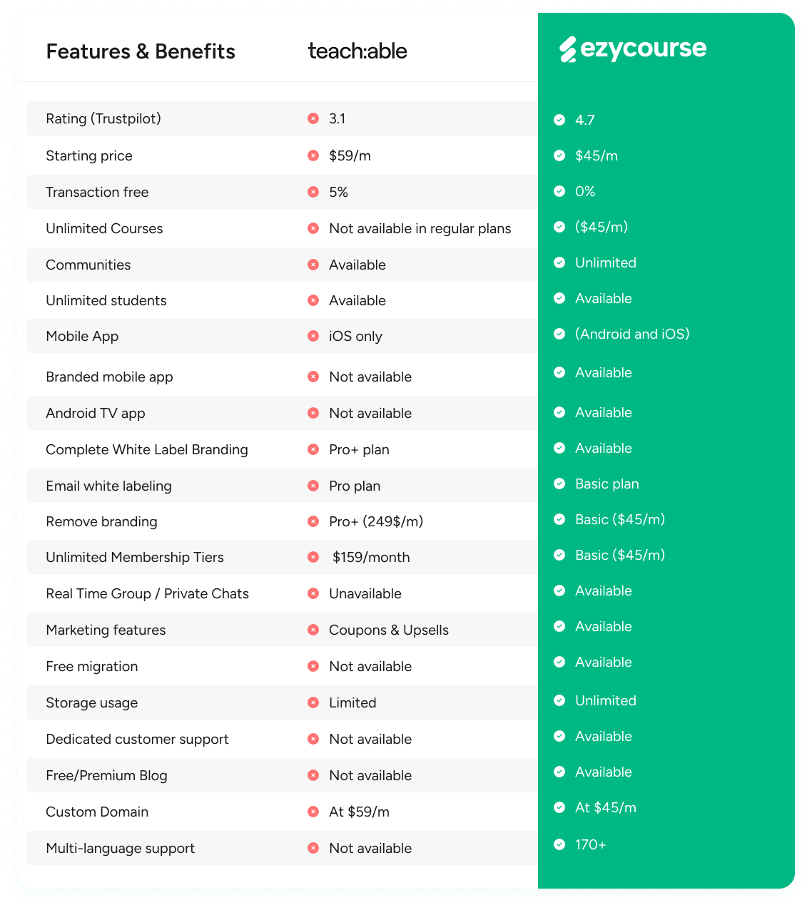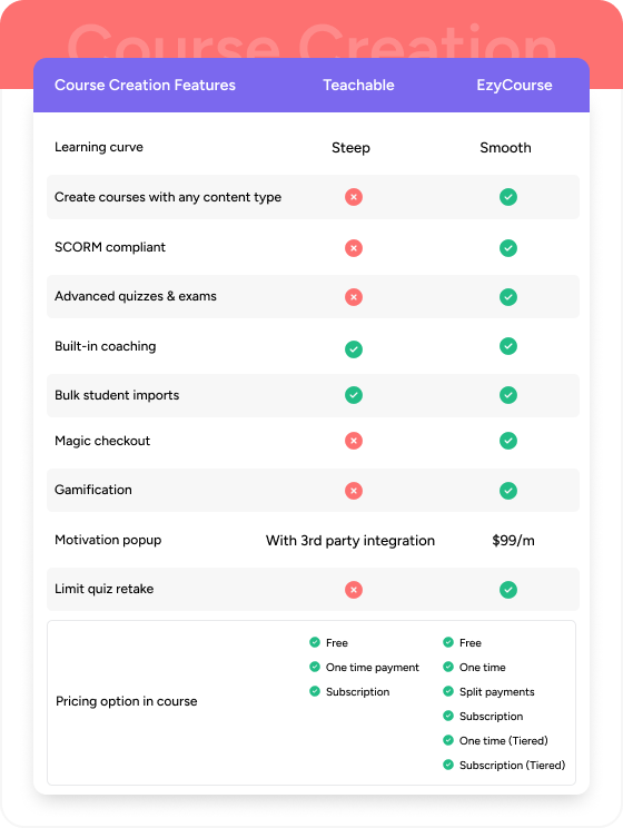 EzyCourse puts you in control of your course creation. It’s easier, more flexible, and has high customization options compared to Teachable. Enjoy 13 lesson types, Zoom live classes, 6 pricing options, unlimited storage, SCORM compliance, advanced quizzes, gamification, and much more!